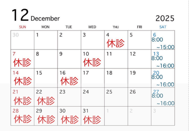 12月のお休みは日曜日と4,10,16,22日の平日がお休みです。