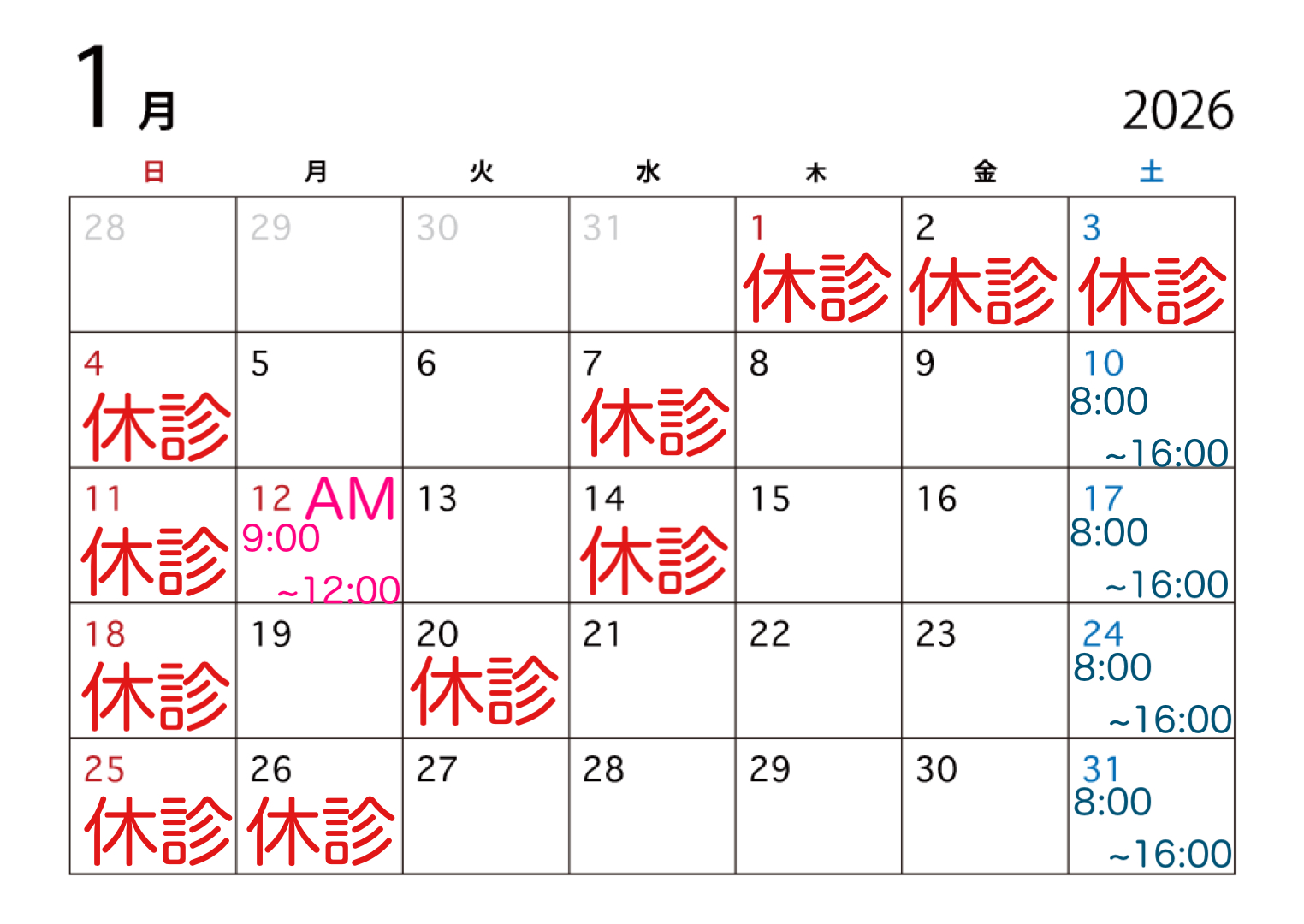 1月のお休みは日曜日と4/7/11/14/18/20/25/26日の平日がお休みです。