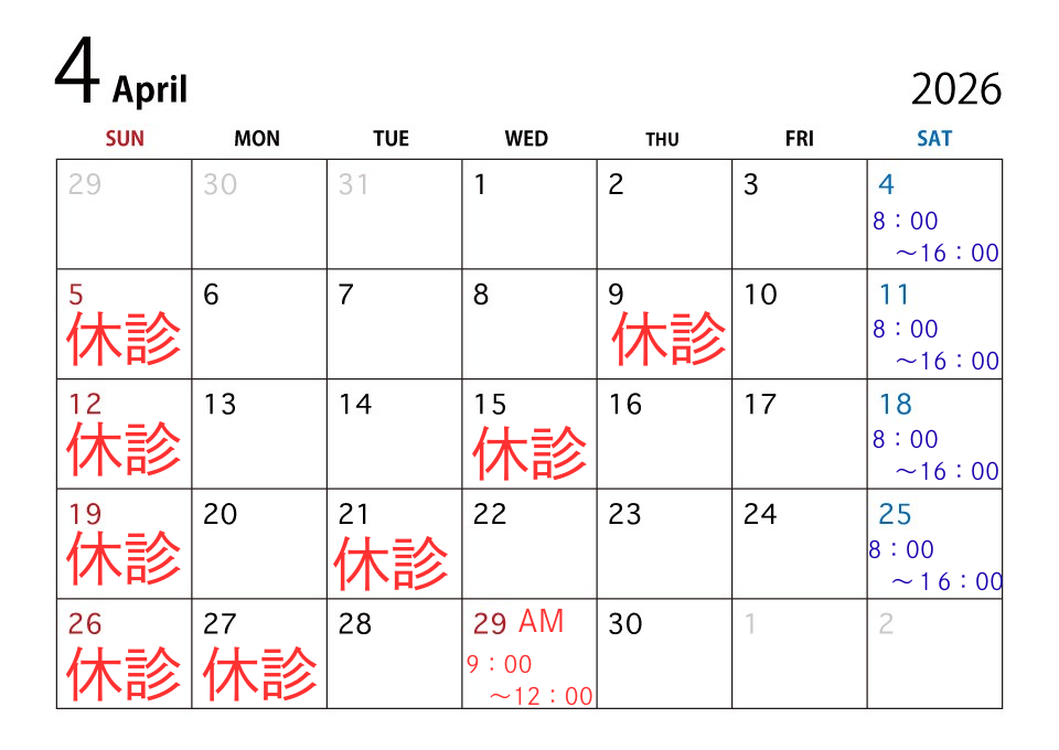 4月の休診日は 毎週日曜日/9日・15日・21日・27日 となっております。