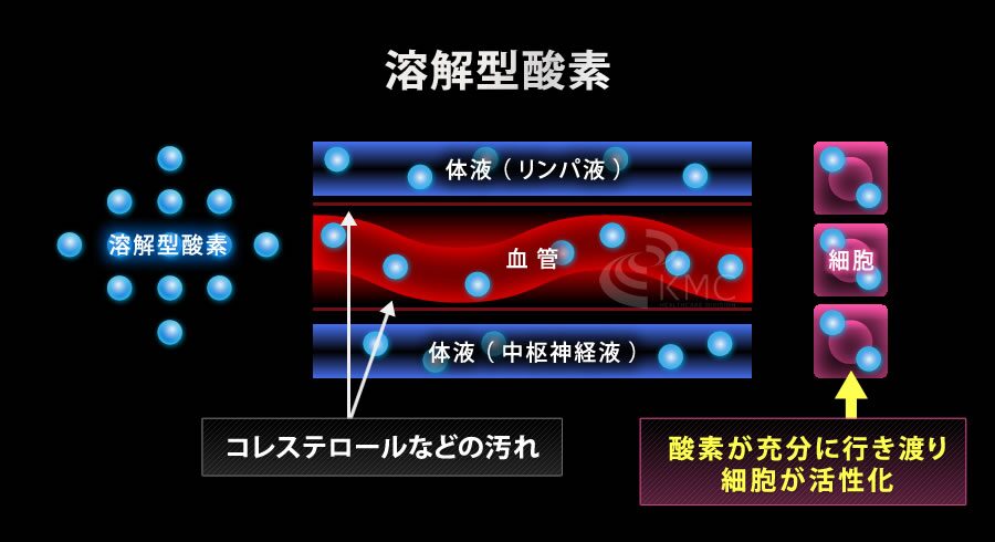 高気圧環境下でより多く取り込み可能な酸素。溶解型酸素は、血液や体液に溶け込むことが可能なサイズの小さい(5ミクロン)の酸素。 通常の呼吸や酸素吸入だけでは溶解型酸素を増やすことは難しく、結合型酸素と比べ毛細血管を通り易く、またごく少量しか存在しません。